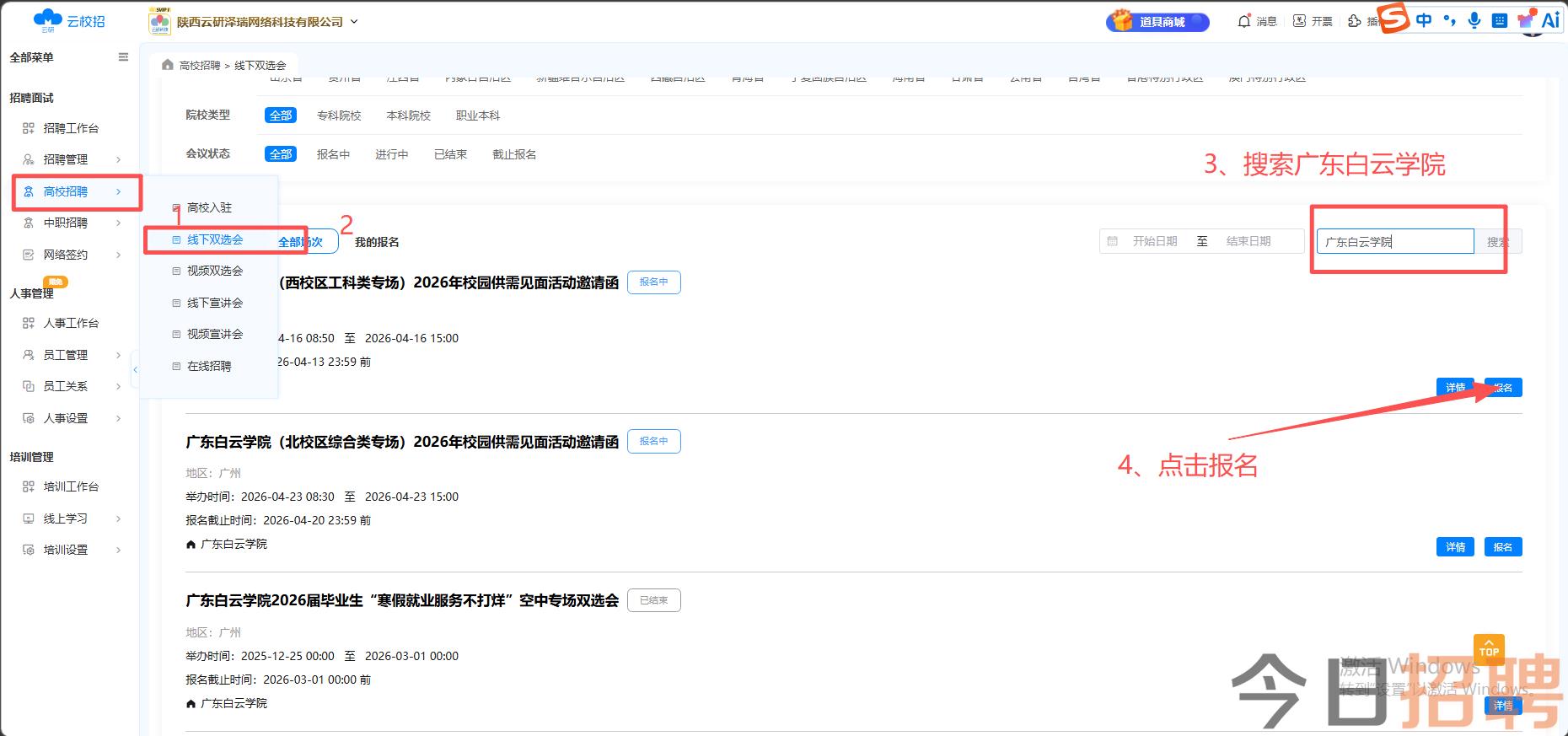 (二)用人單位注冊并登錄云校招平臺后→點擊“校園招聘”→點擊“線下雙選會”→搜索“校名”→選擇具體場次點擊“報名”→填寫職位等信息→提交等待審核。